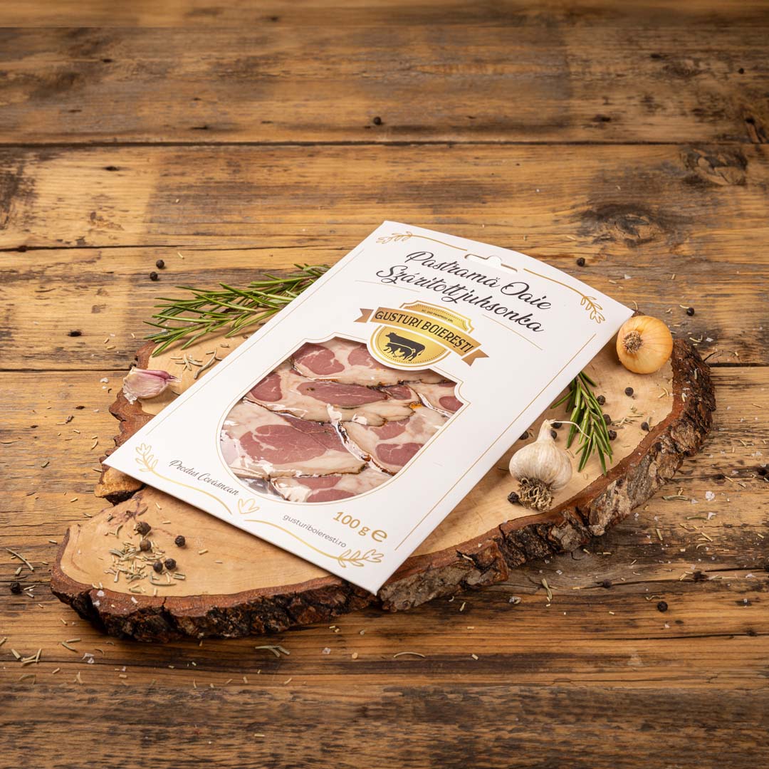 Descoperă savoarea autentică a pastramei de oaie feliată, o specialitate preparată cu măiestrie și atenție la detalii. Feliile subțiri din carne de oaie dezosată (pulpă și spată) sunt condimentate natural și afumate, oferindu-ți un gust autentic și o experiență culinară de neuitat.