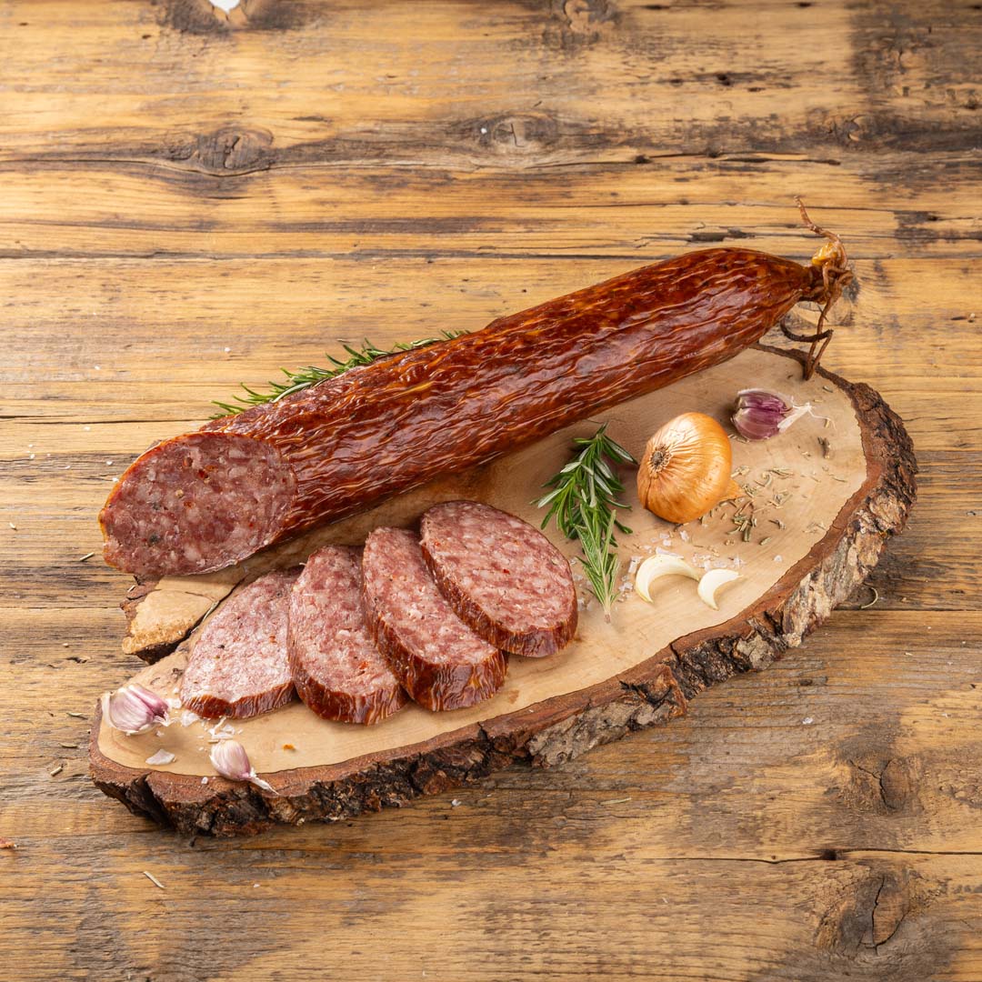 Preparat dintr-un amestec rafinat de carne de cerb, mistreț și porc, completat cu slănină fragedă și condimente atent alese, acest salam crud-uscat și afumat oferă o experiență culinară deosebită.